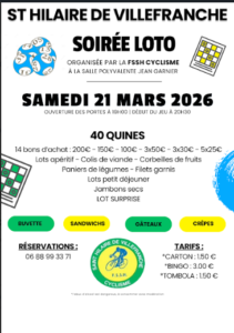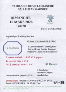 Le repas des aînés aura lieu le samedi 14 mars 2026 à 12 h, salle Jean-Garnier. Il est offert à tous les Hilairois et Hilairoise de 65 ans et plus mais rien n’empêche les plus jeunes de participer en réglant le prix du repas (accompagnants de moins de 65 ans ou hors commune : 29€…