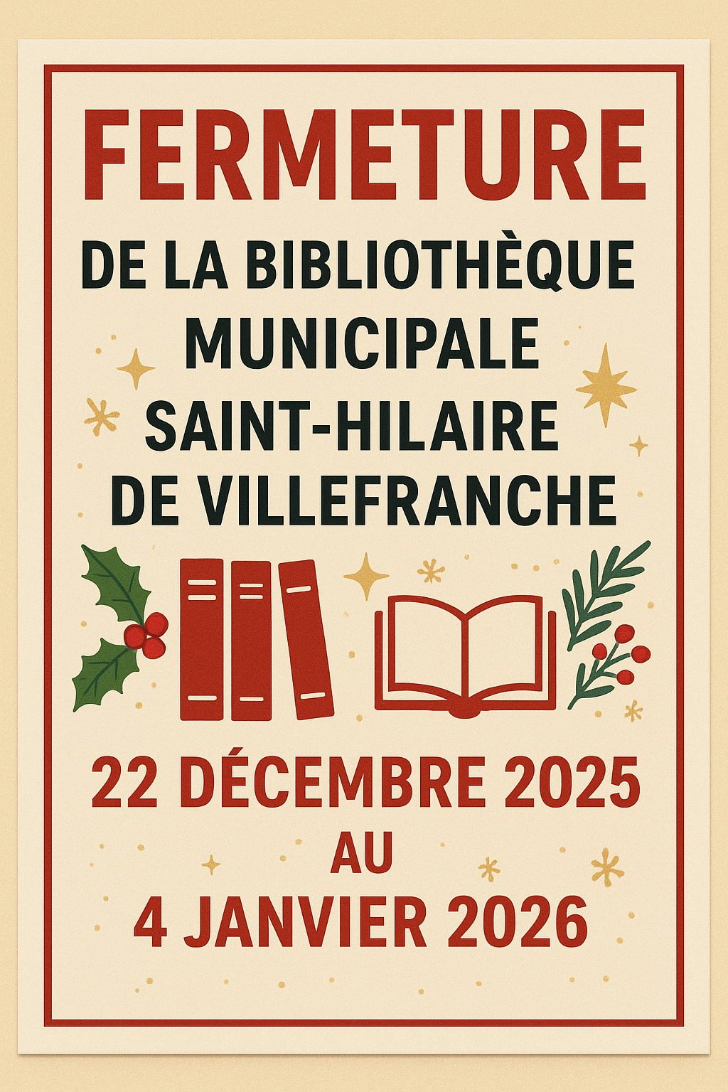 La bibliothèque sera fermée pendant les vacances d’hiver. Vous pouvez venir avant, prendre plus de livres et les rendre après les vacances ou plus tard. Les bénévoles sont là pour vous conseiller . Actuellement mise en place de nombreux ouvrages achetés récemment. Venez les découvrir.