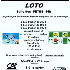 Loto des Anciens Pompiers 08 Mar 14:00 - 19:00 Salle Polyvalente Jean Garnier St Hilaire de Villefranche(17)