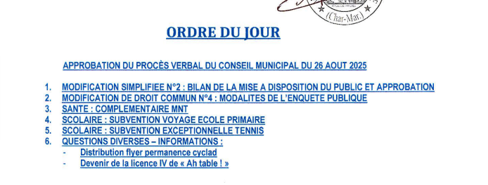 Prochain Conseil Municipal: Jeudi 16 Octobre 2025Par c.cabaup / 14 octobre 2025 Le prochain Conseil Municipal se tiendra le Jeudi 16 Octobre 2025 à 18h30 à la Mairie- Salle des Mariages Facebook Twitter LinkedIn Email Imprimer