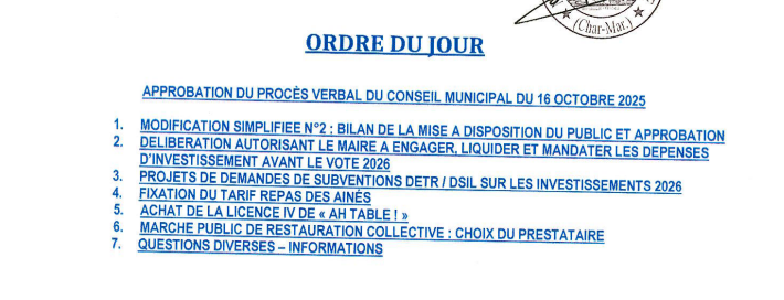 Le prochain conseil municipal se tiendra le jeudi 27 novembre à 18h30 Salle du Conseil à la Mairie.